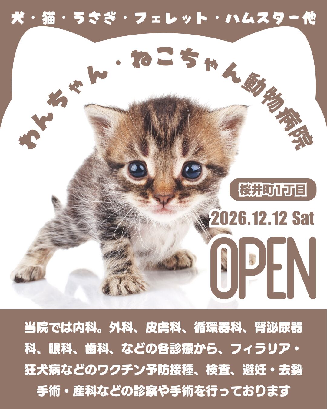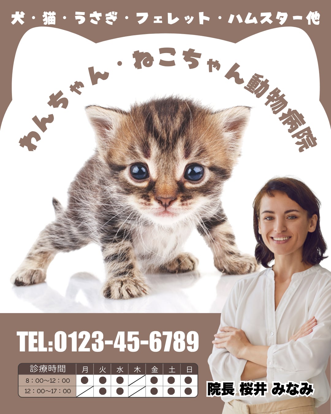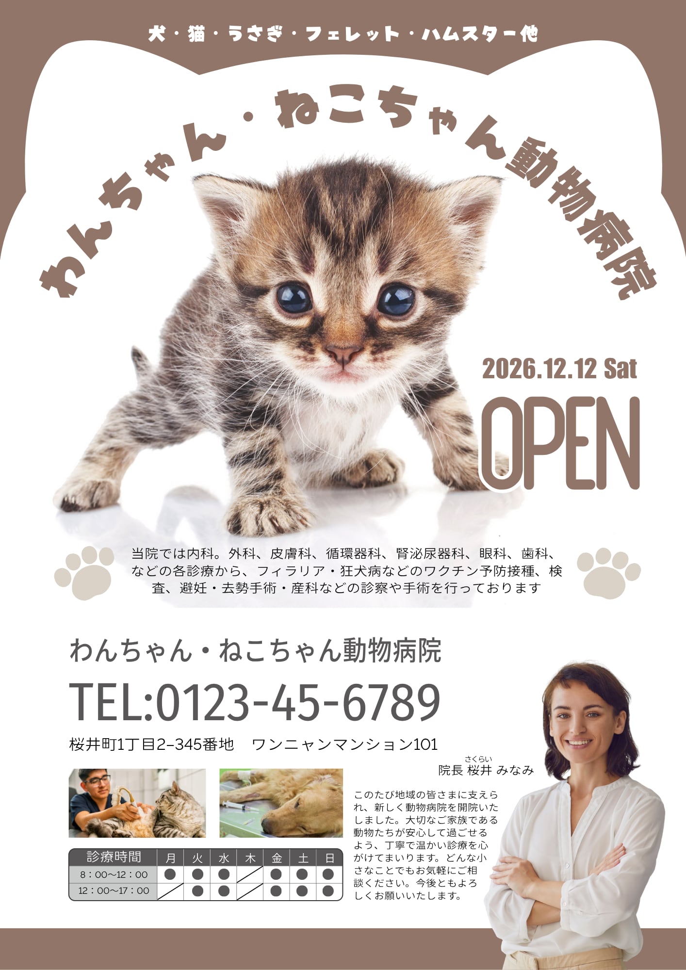 • テンプレート内の院長と院内の2枚の画像はイメージです。実際にご利用の際は、ご自身の写真に差し替えてご活用ください。(猫ちゃんのメインの画像はそのまま使用して構いません)