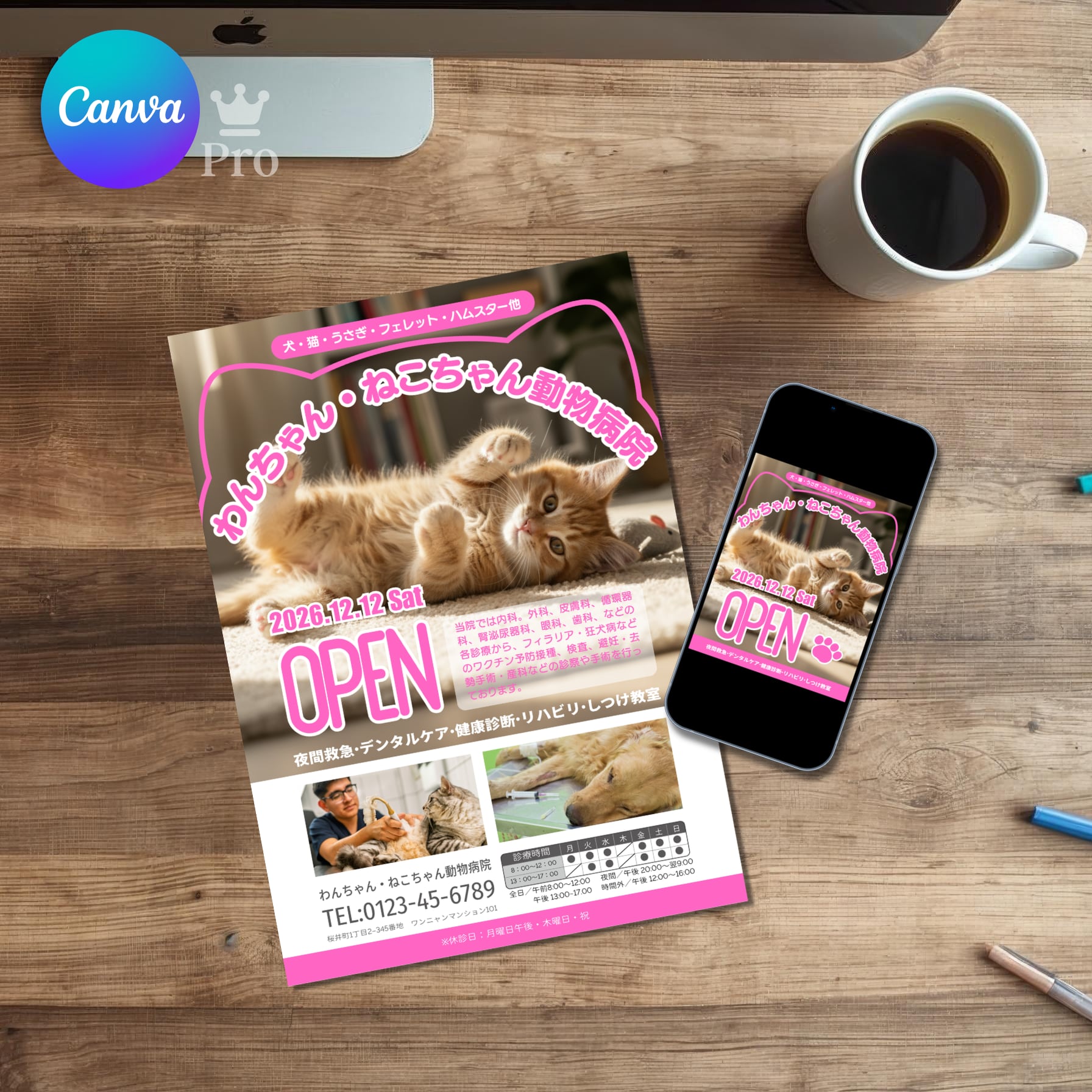 【Canva Pro(有料版)テンプレート】動物病院・ペットサロン向けチラシ&Instagram投稿用セット|新規OPEN・告知用
