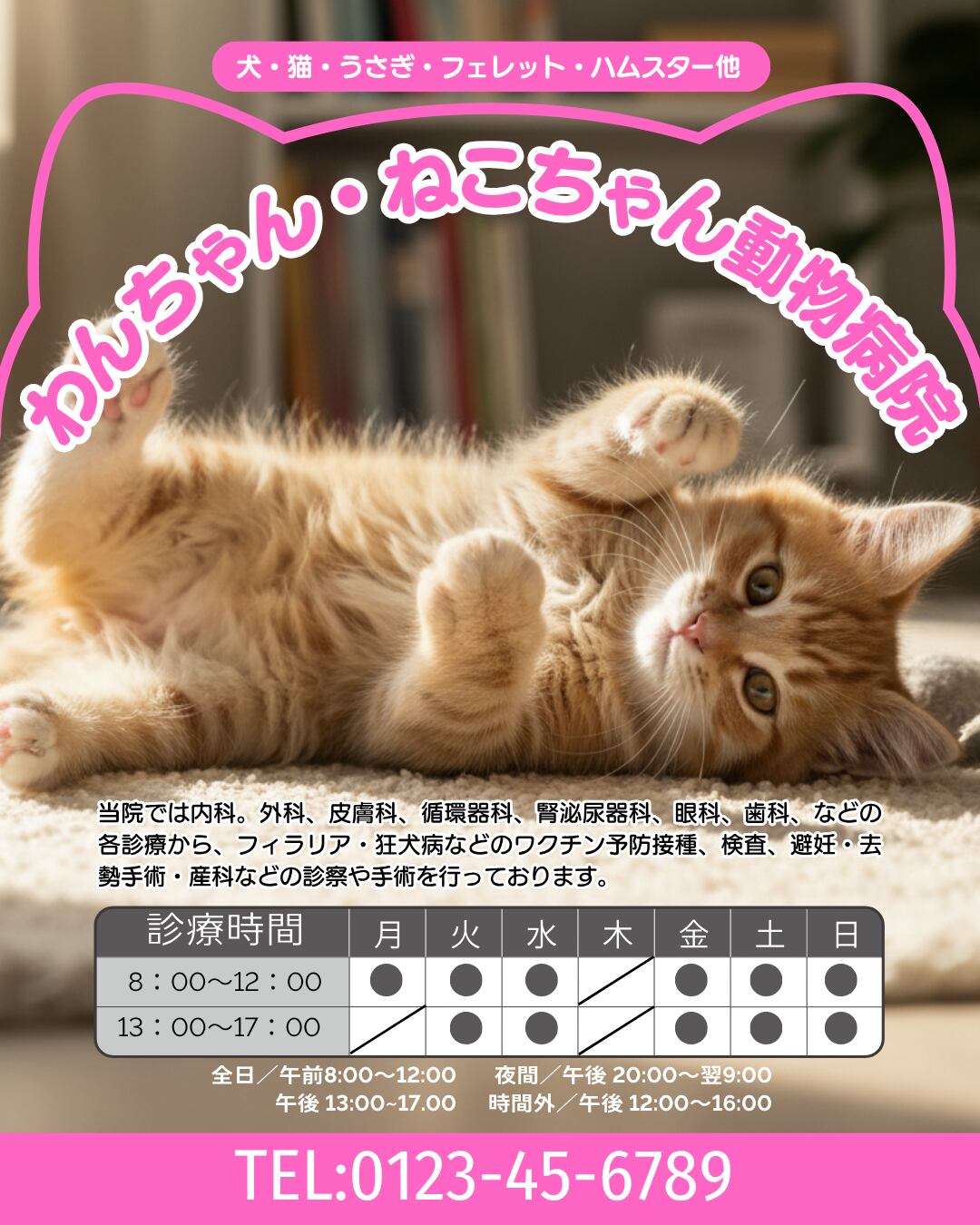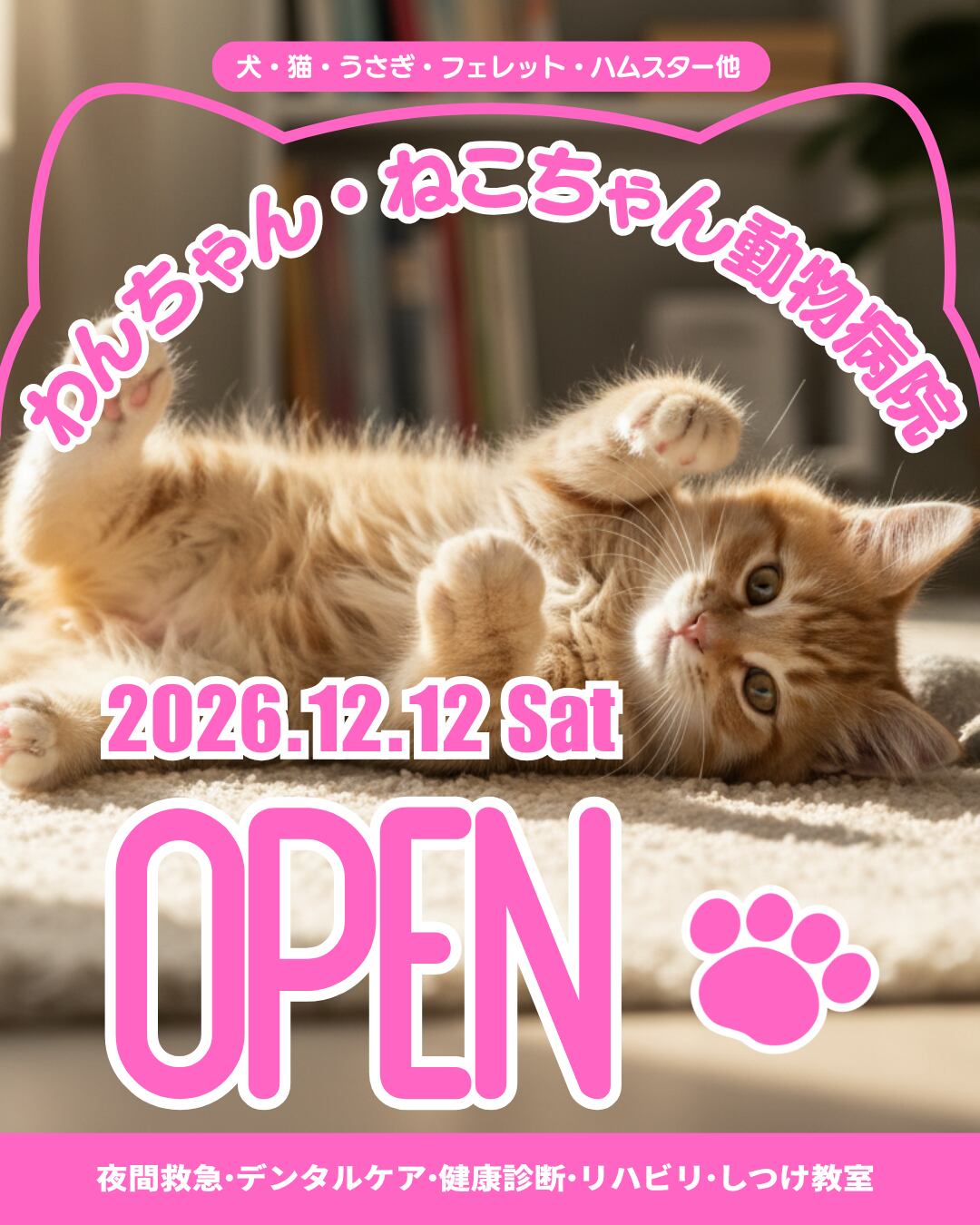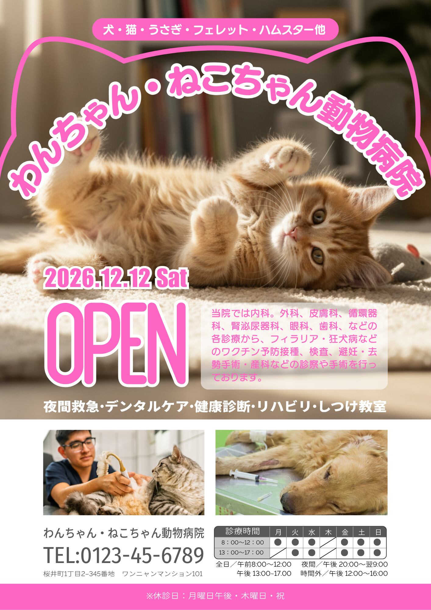 • テンプレート内の院内の2枚の画像はイメージです。実際にご利用の際は、ご自身の写真に差し替えてご活用ください。(猫ちゃんのメインの画像はそのまま使用して構いません)