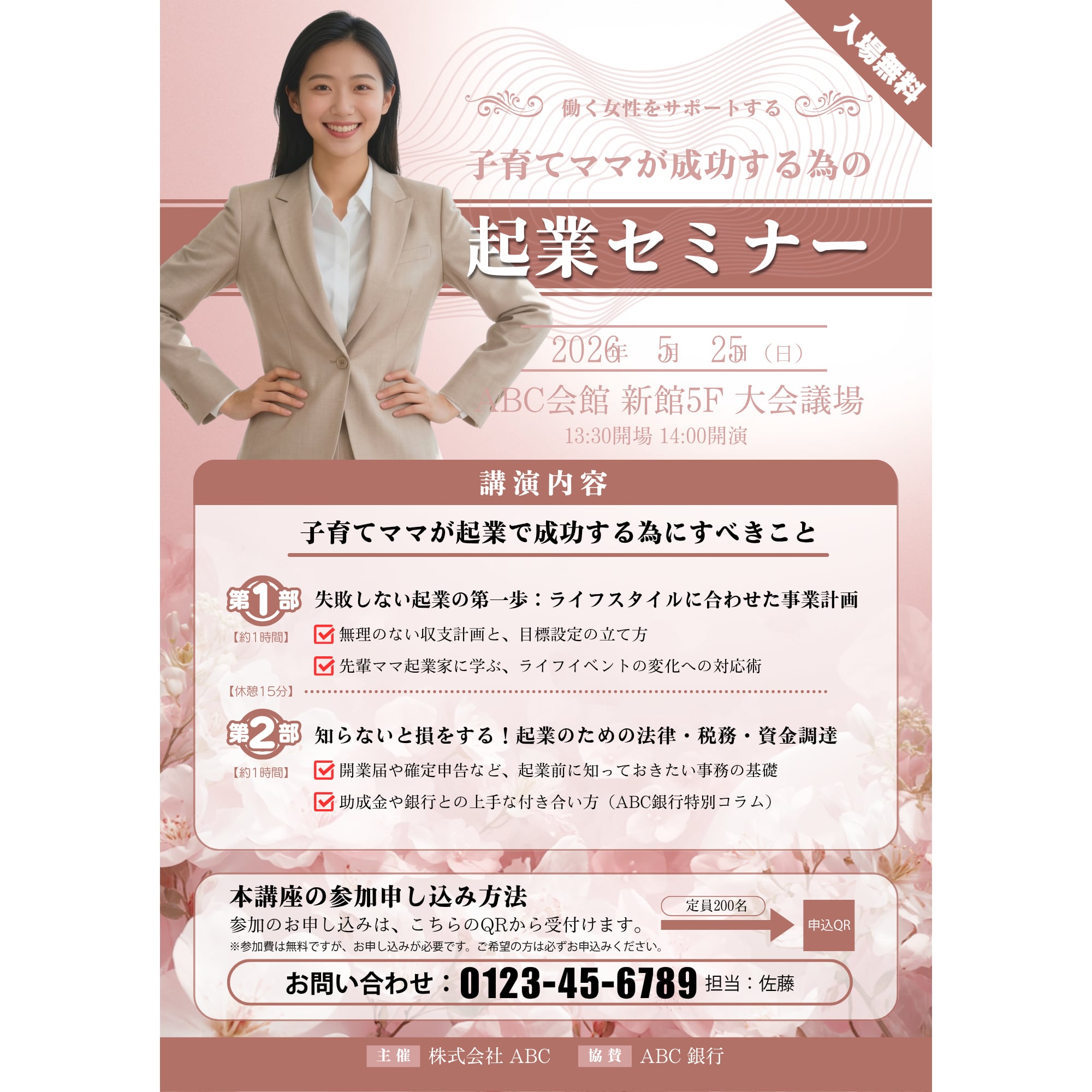 • QRコード枠完備: 申し込みフォームへの誘導もスムーズ。Web予約が主流の現代に最適な設計です。