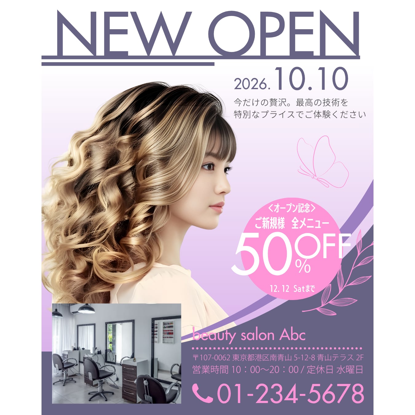 • 一目で伝わる特別感: 「NEW OPEN」の文字と割引率がパッと目に飛び込む設計。新規のお客様を逃しません。