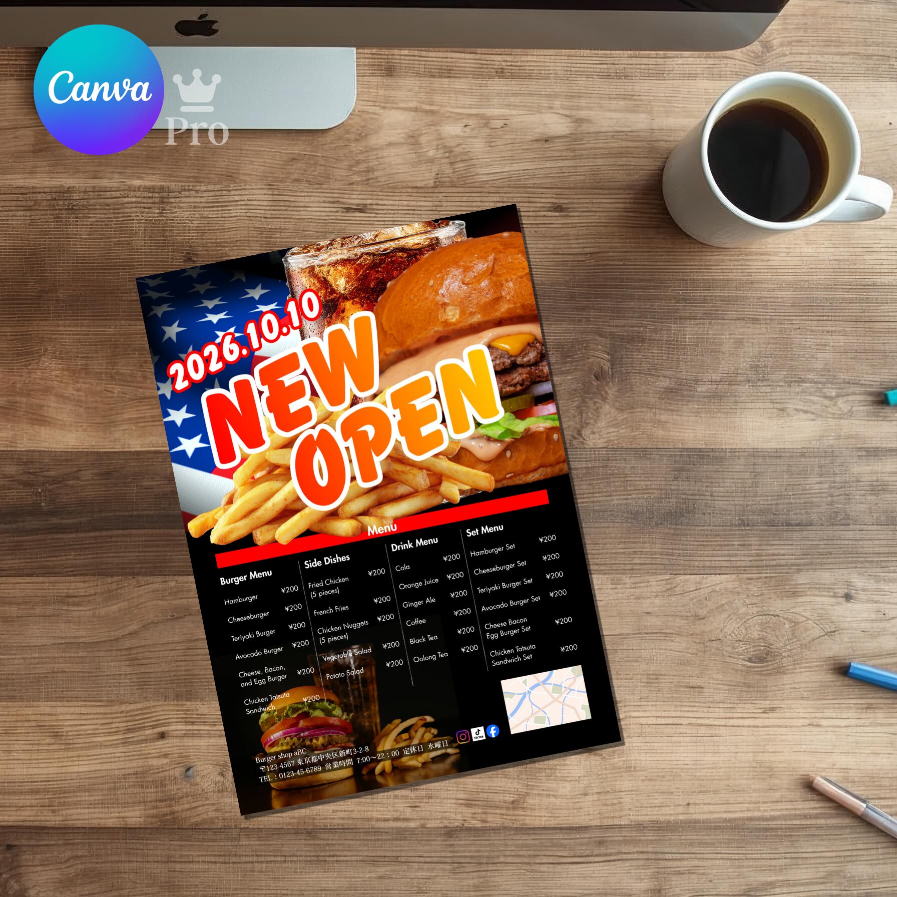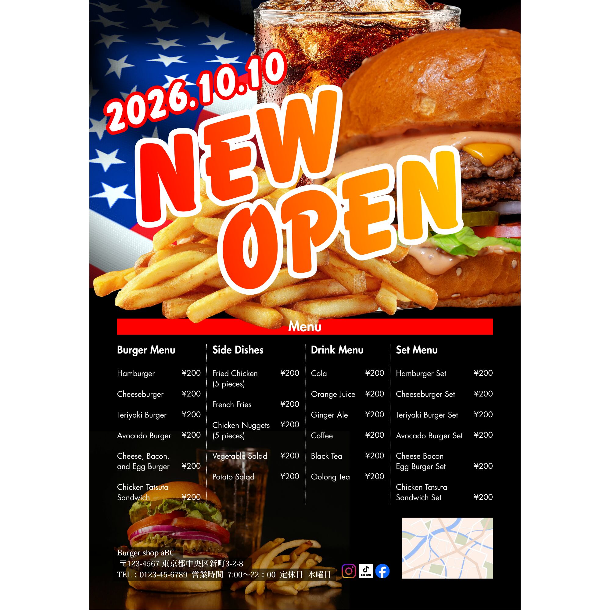 #Canvaテンプレート #飲食店チラシ #バーガーショップ #新規オープン #メニュー表 #アメリカンデザイン #チラシ制作 #キッチンカー集客