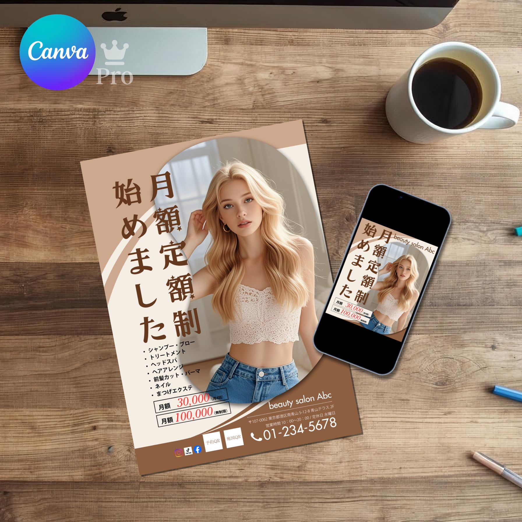 • スマホで簡単カスタマイズ: 専門知識がなくても、スマホやPCのCanvaアプリでサロンの写真やメニューに差し替えるだけで完成します。