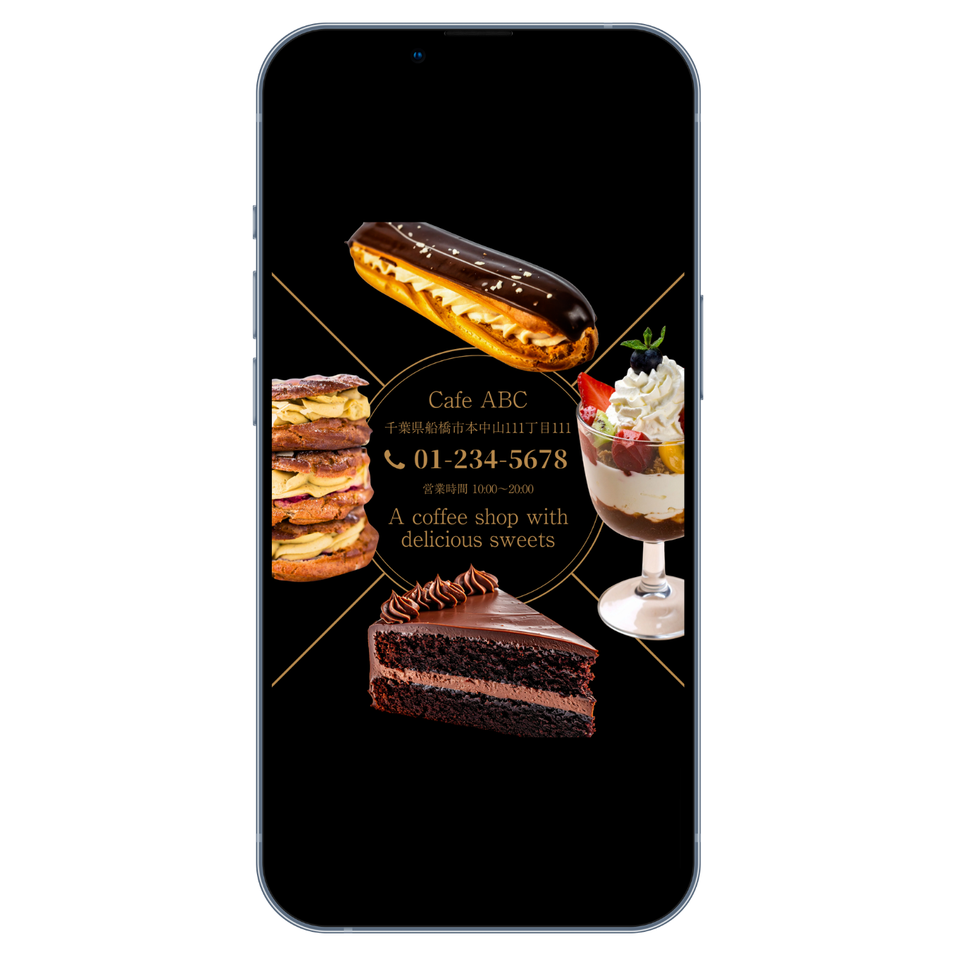 • スイーツが主役のデザイン: 黒背景にゴールドのアクセントを効かせたレイアウトが、商品の色鮮やかさとディテールを際立たせます。