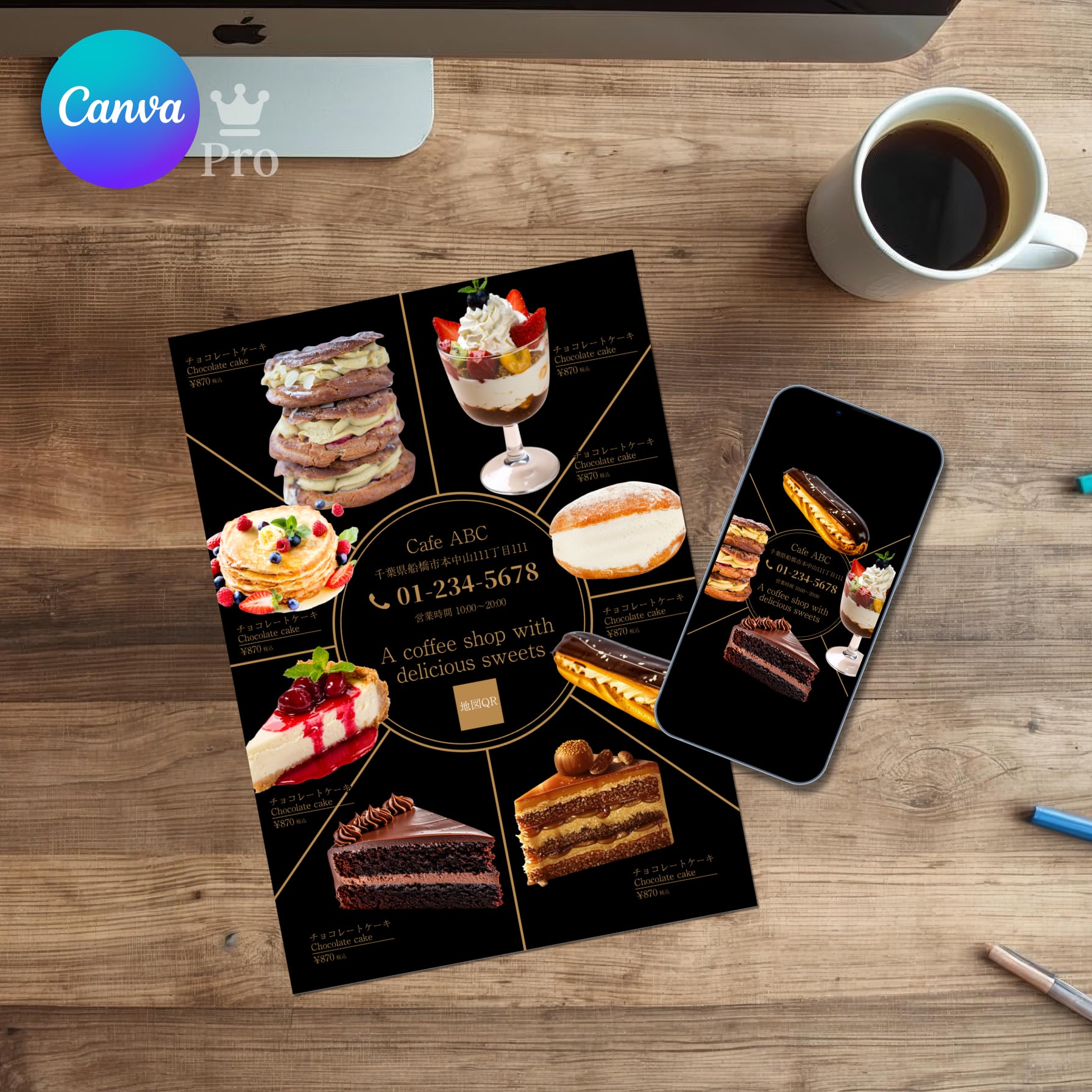 【Canva Pro(有料版)テンプレート】カフェ・スイーツ店向け「高級感あふれるメニューチラシ」&Instagram投稿セット|A4サイズ
