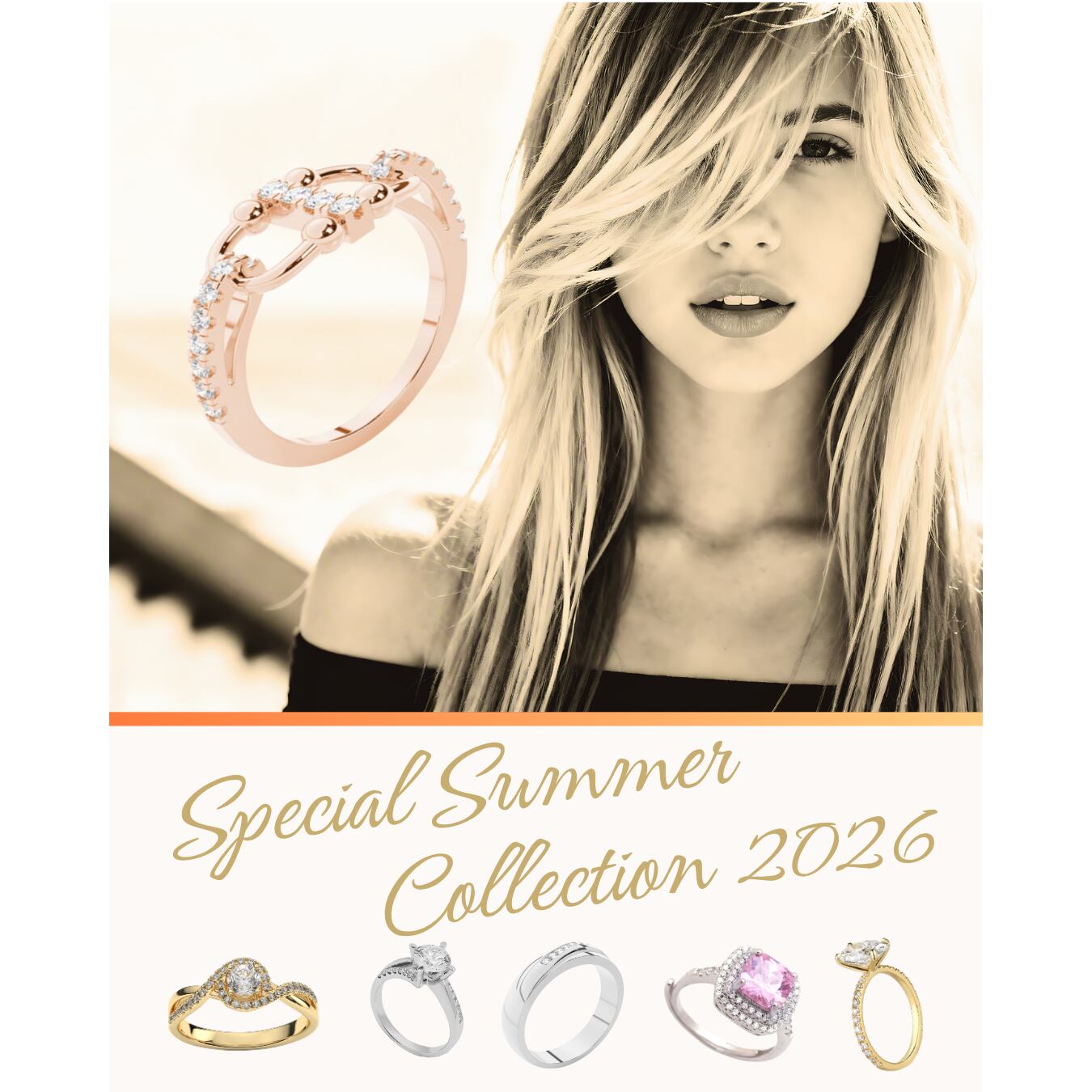 • 情緒的なブランドイメージ: 美しいモデルカットと「Special Summer Collection」の流麗なスクリプトフォントが、洗練されたブランドの世界観を演出します。