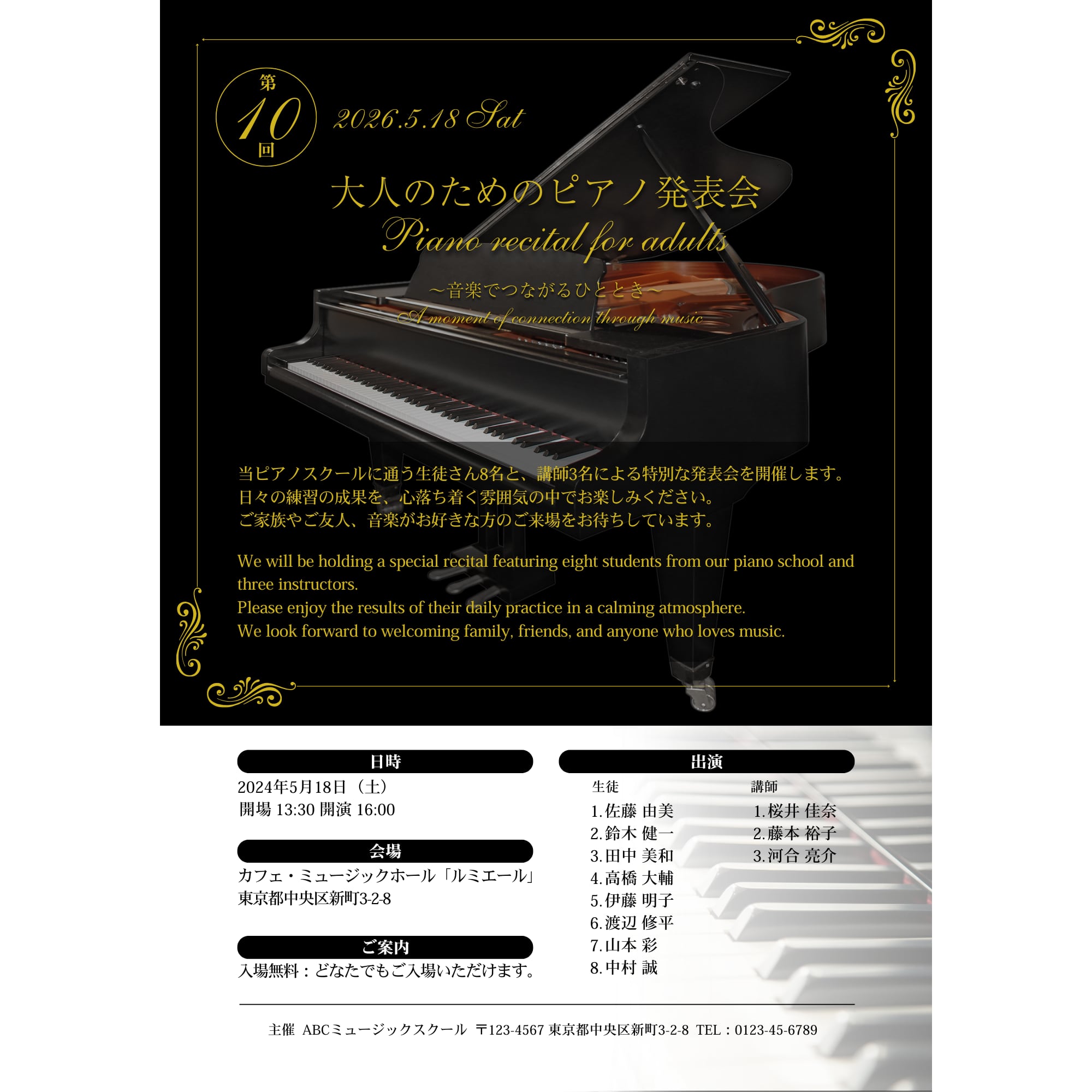 「特別な一日を、最高の一枚で彩る。大人のための洗練されたピアノ発表会テンプレート。」
