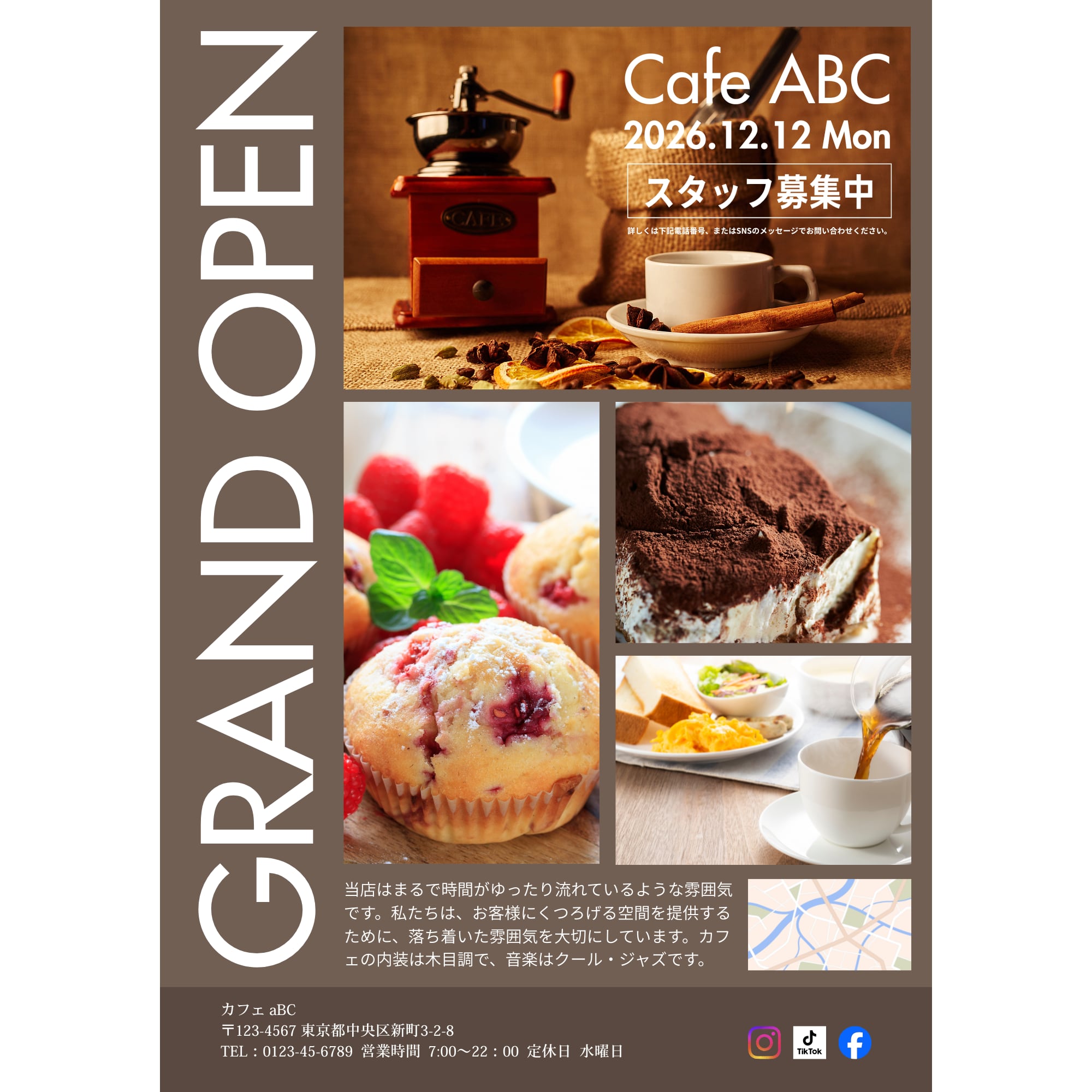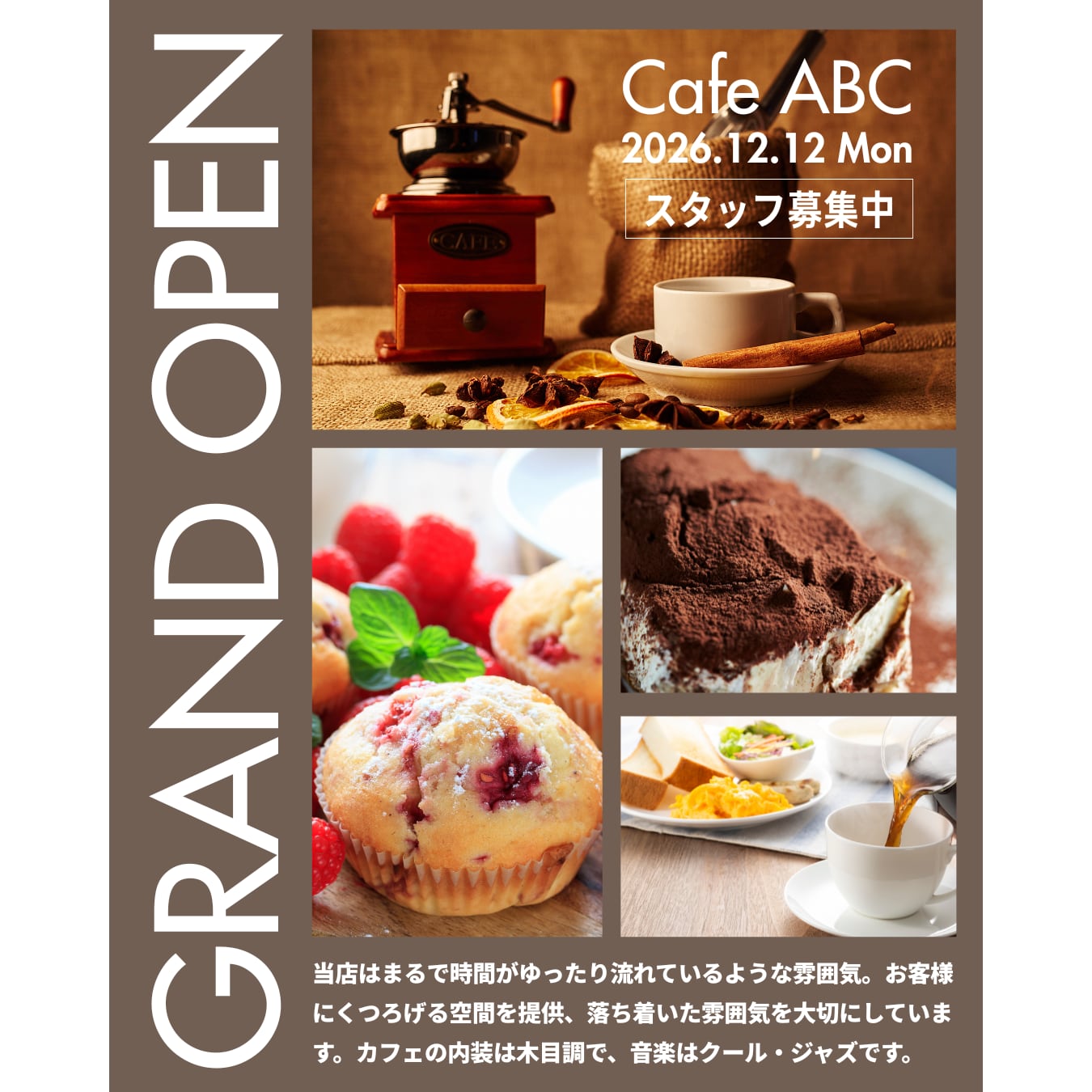【Canva Pro(有料版)テンプレート】カフェ・喫茶店向け「グランドオープン告知チラシ」&Instagram投稿セット|ブラウンの落ち着いたモダンデザイン|A4サイズ